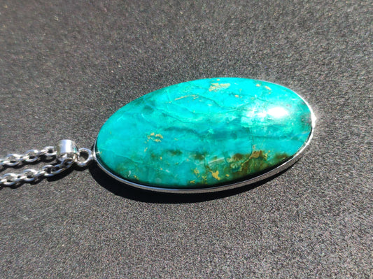 Collier Chrysocoll AAA ~ avec monture en argent sterling 925 + œillet et chaîne en acier inoxydable 304 avec fermoir mousqueton Origine : -Pérou Poli : -Pérou, dans notre production...