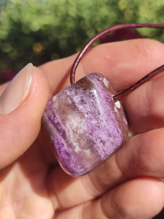 Un magnifique pendentif en Sugilite Comprend un cordon en cuir marron antique de 1,5 mm à nouer à la longueur souhaitée. Les pierres précieuses et les cristaux ont des effets...