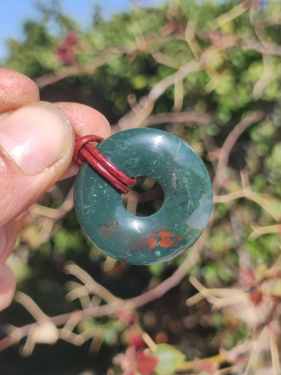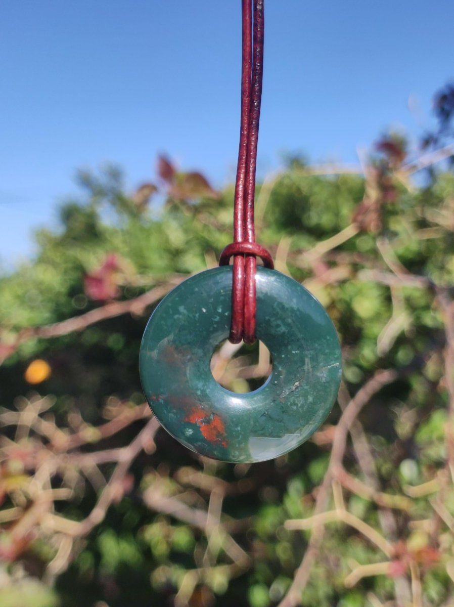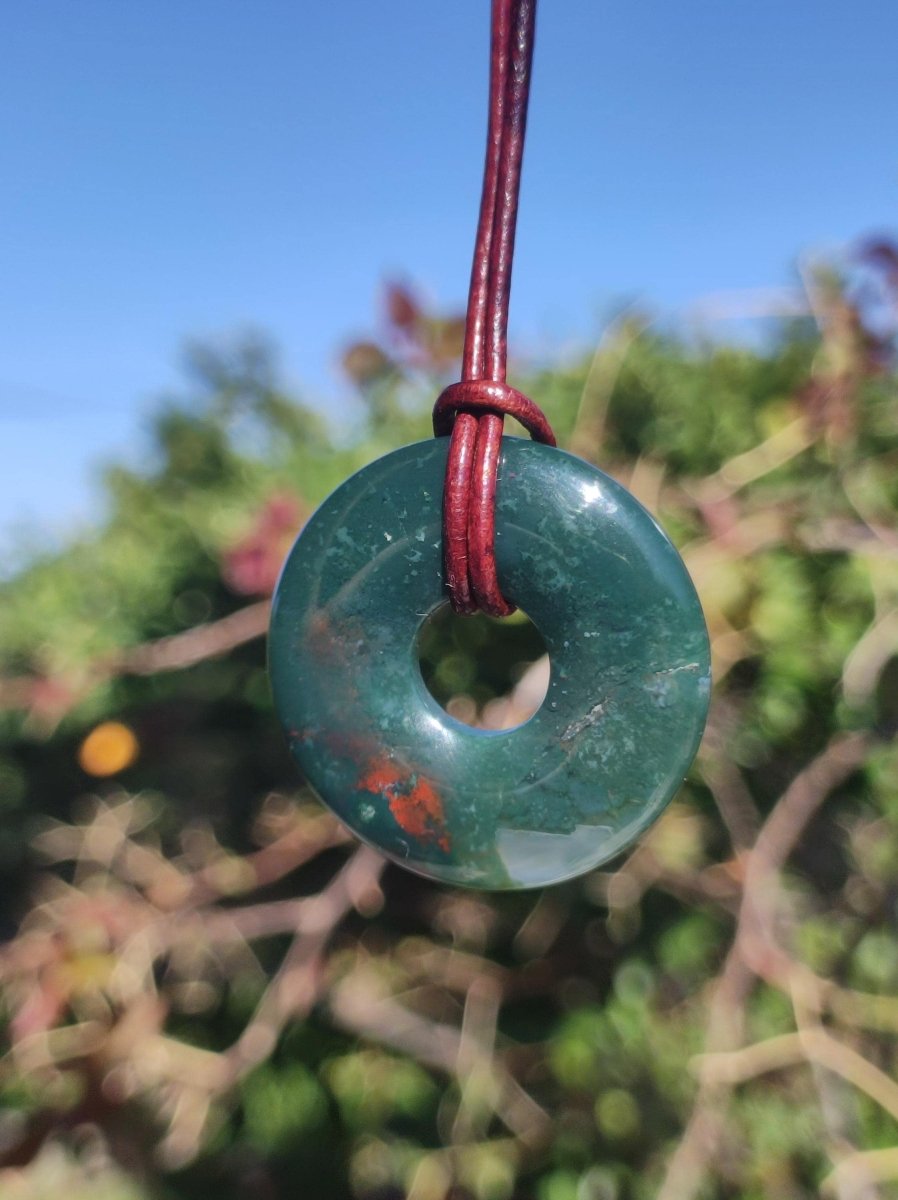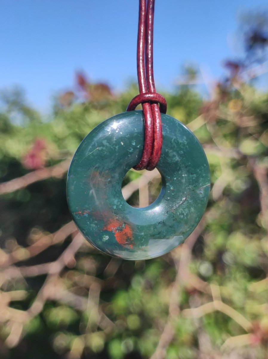 Heliotrop ~ Donut 30mm ~ Edelstein Kette ~ inkl. 2mm Lederband in Antik Braun zum Knoten Heliotrop In der Steinheilkunde nach Hildegard von Bingen spielt der Heliotrop, auch Blutjaspis genannt,...