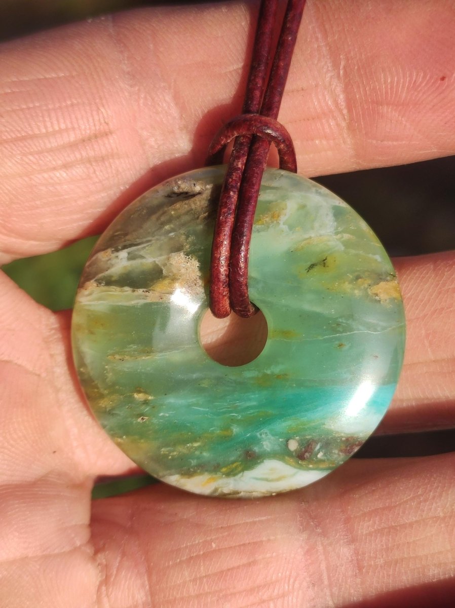 Andenopal ~ Donut 30mm Edelstein Kette ~ inkl. Lederband 1,5mm in Antik Braun zum Knoten für Wunschlänge. Traumhafte neue seltene Rarität! Herkunft Andenopal: -Peru Geschliffen: -Peru, in unserer Produktion Größe:...