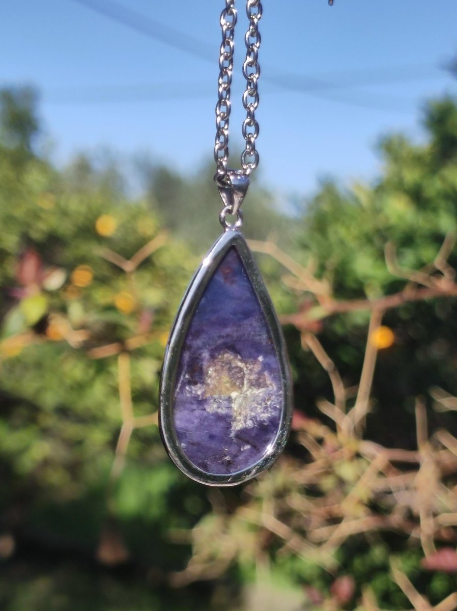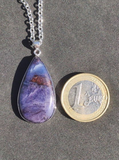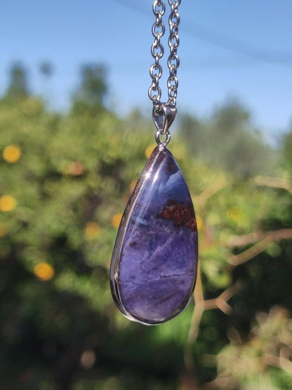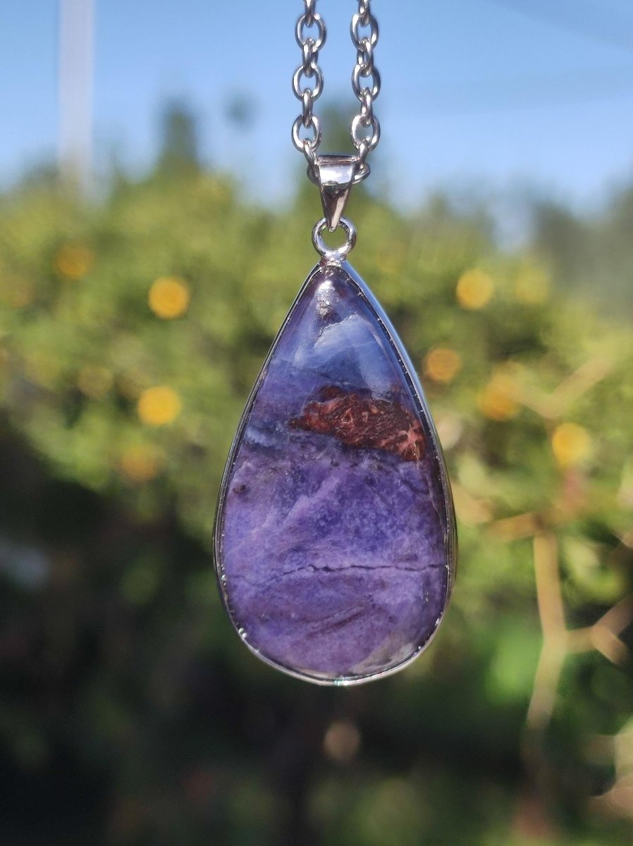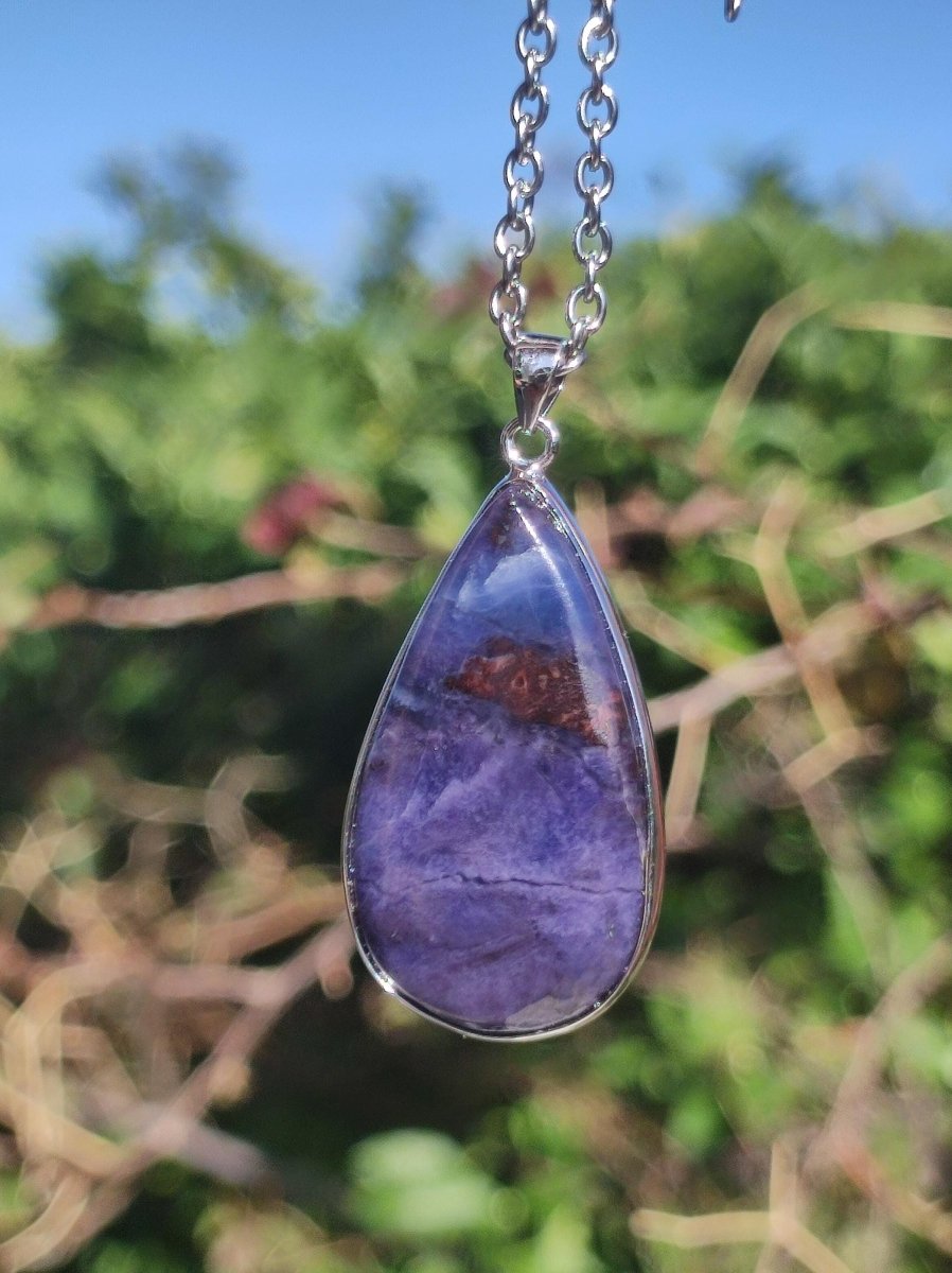 Edelstein Kette mit einem echtem ~Sugilith mit Richterit & Bustamit~ in einer 925 Silberfassung + Öse & einer 304 Edelstahl Kette mit Karabinerverschluss